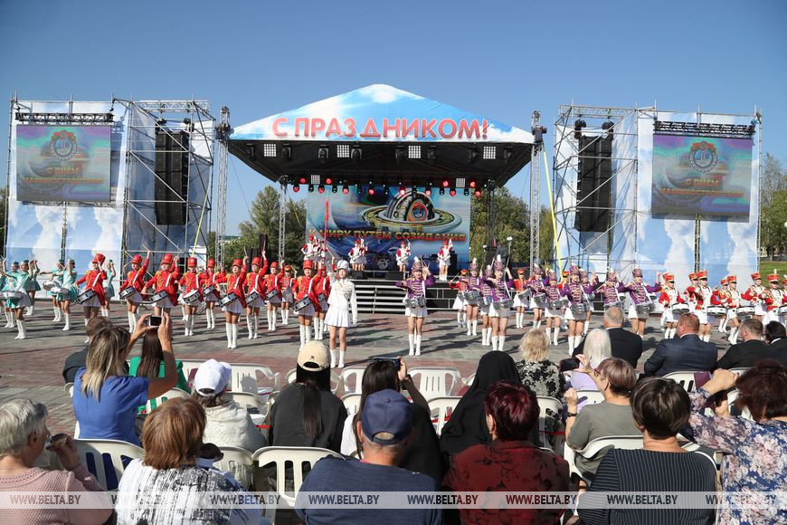 Сцена под открытым небом рядом с концертным залом начала "звучать" около 15.00. Церемонию открытия, да и весь вечер, сопровождали выступления любительских творческих коллективов предприятий системы Минпрома. Аналогичный концерт, или торжественное собрание "К миру путем созидания" с элементами шоу, спустя два часа стартовал в самом КЗ "Витебск".