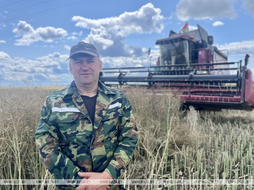Сейчас в поле площадью 200 га убирают рапс три отечественных комбайна. За рулем одного из них - старший комбайнер Николай Леохин. Несколько сезонов в период уборочной мужчина брал отпуск на основной работе, чтобы помочь хозяйству в битве за урожай. Но, говорит, душу не обманешь, а потому пришел на работу в "Могилевский ленок" уже на постоянной основе.