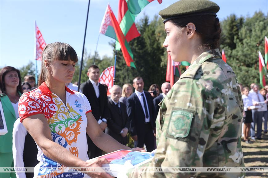 На аллее будет представлена и Минская область, всего на ней разместится более 150 полотен с символикой городов. Почетное право принять их от заслуженных представителей области и передать председателю общественного объединения "Патриоты Беларуси" Николаю Зарубицкому получили воспитанники военно-патриотического клуба "Гранит".