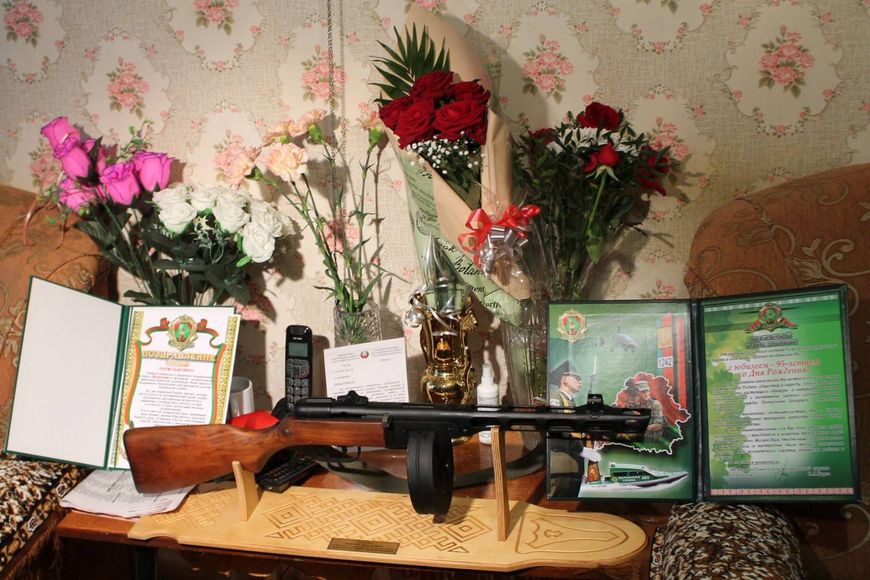 В подарок от председателя Государственного пограничного комитета Беларуси Анатолия Лаппо юбиляру передали массогабаритный макет пистолета-пулемета Шпагина. От личного состава пограничной группы - сувенир, набор к праздничному столу. Ветерану адресовали и благодарственные письма, поздравления, а также открытки и рисунки детей.