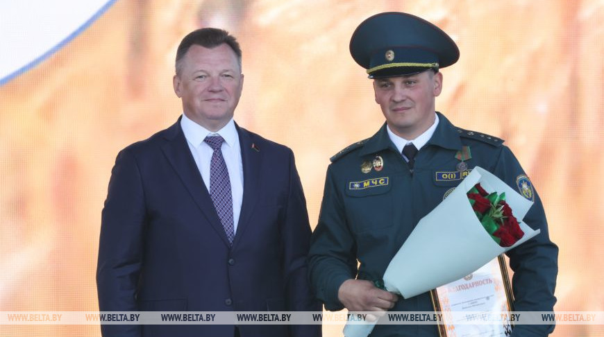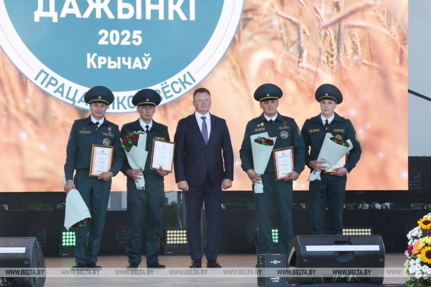 Поздравили мобильную группу из 18 спасателей, сформированной по инициативе Могилевского облисполкома. За сезон команда собрала 7,5 тыс. т зерна. А всего в этом году 233 спасателя в свободное от службы время сражались за урожай. "Сегодня многие из наших спасателей заслужили почетное звание хлеборобов", - подчеркнул министр по чрезвычайным ситуациям Вадим Синявский.