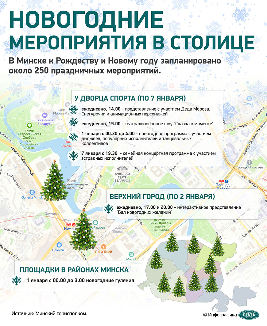 "Будет задействовано 168 бригад скорой помощи. Непосредственно в местах массовых гуляний - выдвигается до 30 бригад скорой помощи. Непосредственно в новогоднюю ночь выделяется 8 бригад скорой помощи: 3 бригады у Дворца спорта, по одной - у "Чижовка-Арены", Комаровского рынка, Ледового дворца, парка имени Павлова, Минского городского дворца культуры. В резерве находятся 4 бригады", - рассказал Сергей Подковыров.-0-