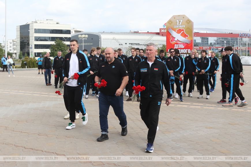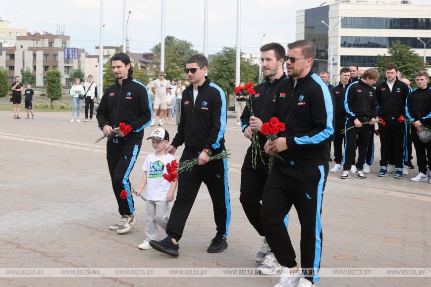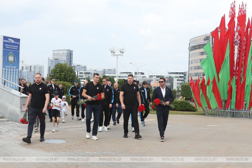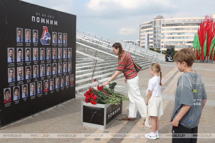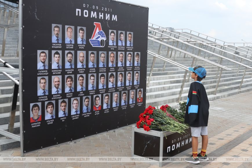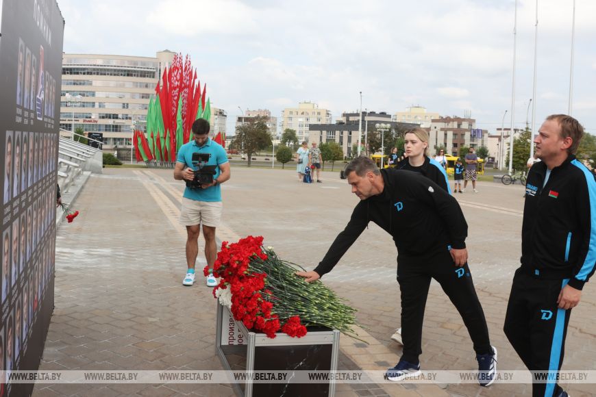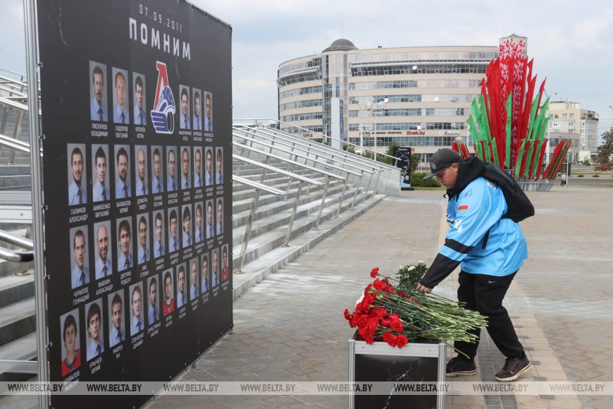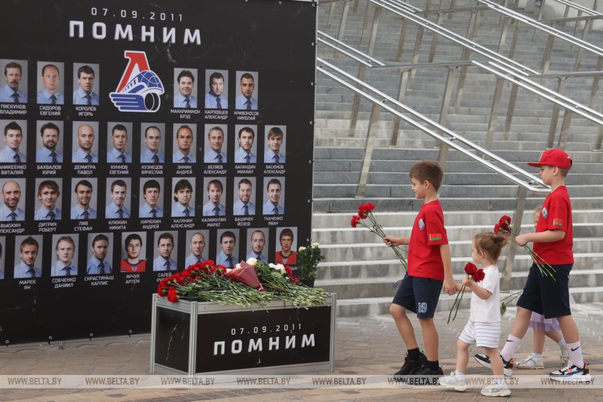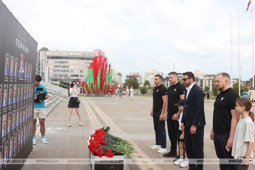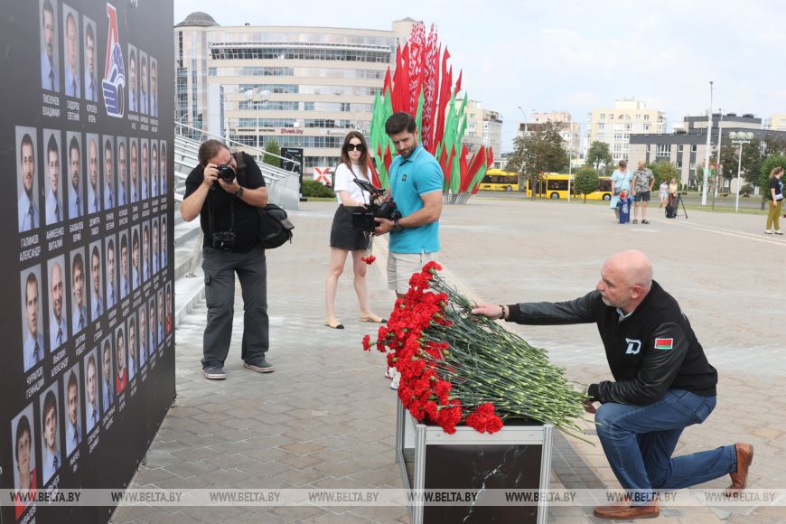 В 14-ю годовщину трагедии почтить память хоккеистов могли все желающие. Цветы к мемориалу возложили руководство и председатель Федерации хоккея Беларуси Александр Богданович, а также тренеры и игроки ХК "Динамо-Минск".-0-