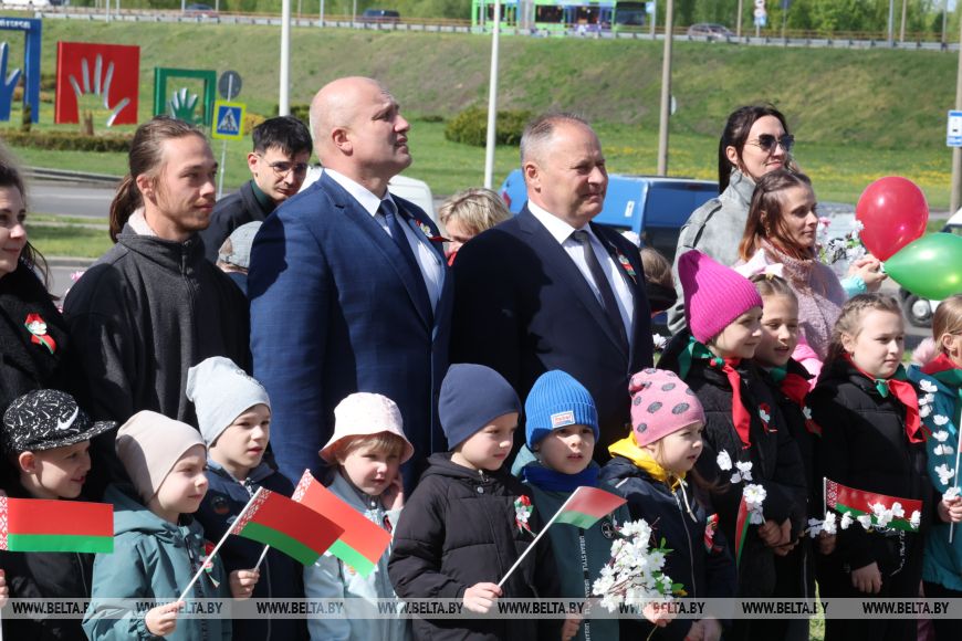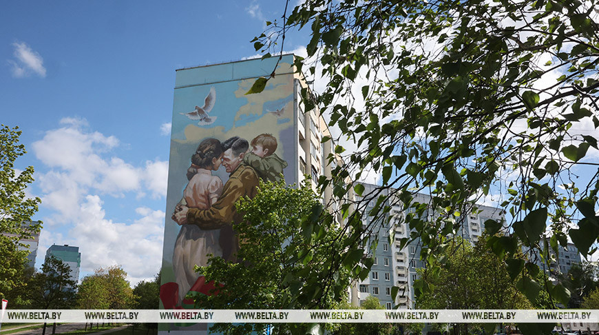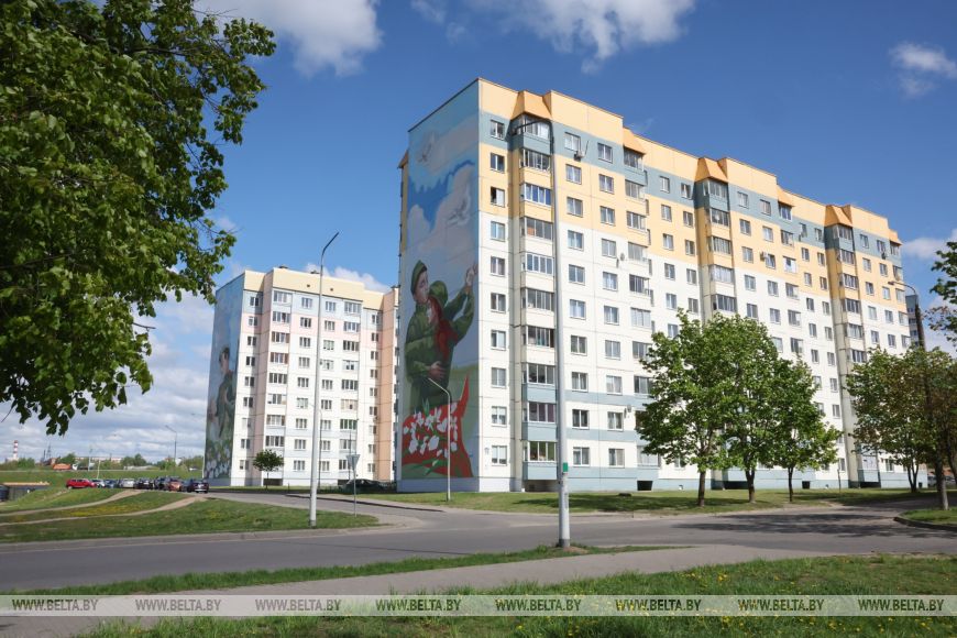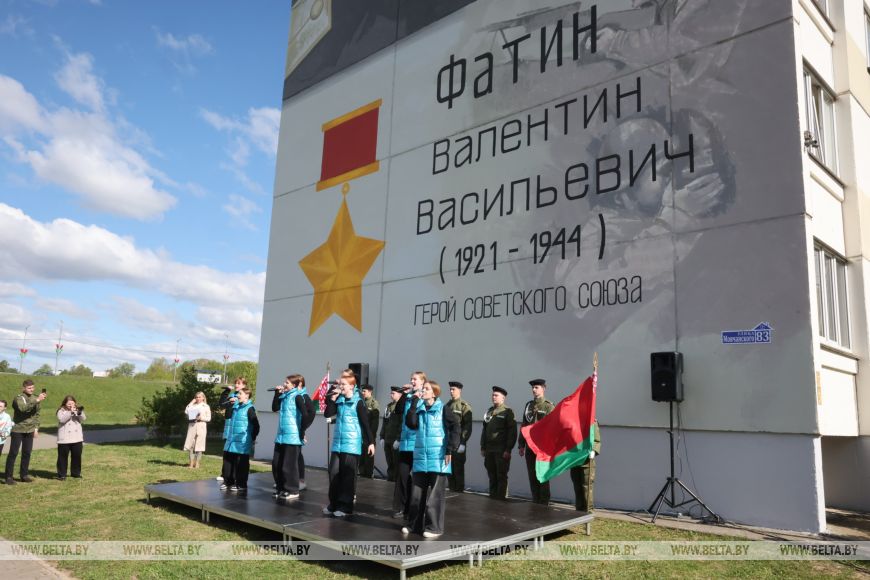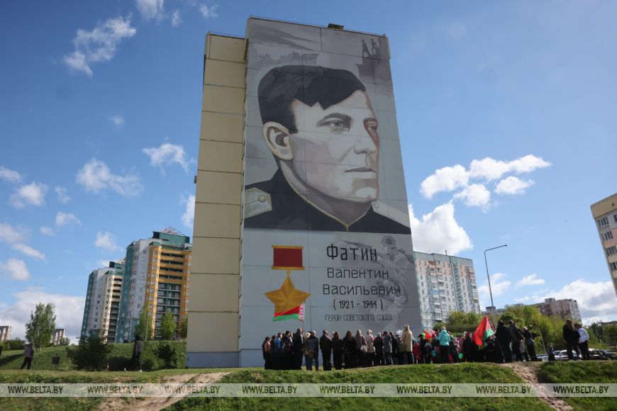 Первый мурал - именной, на фасаде изображен участник освобождения Беларуси во время Великой Отечественной войны, герой Советского Союза капитан Валентин Васильевич Фатин. Он героически погиб в бою в июле 1944 года.-0-