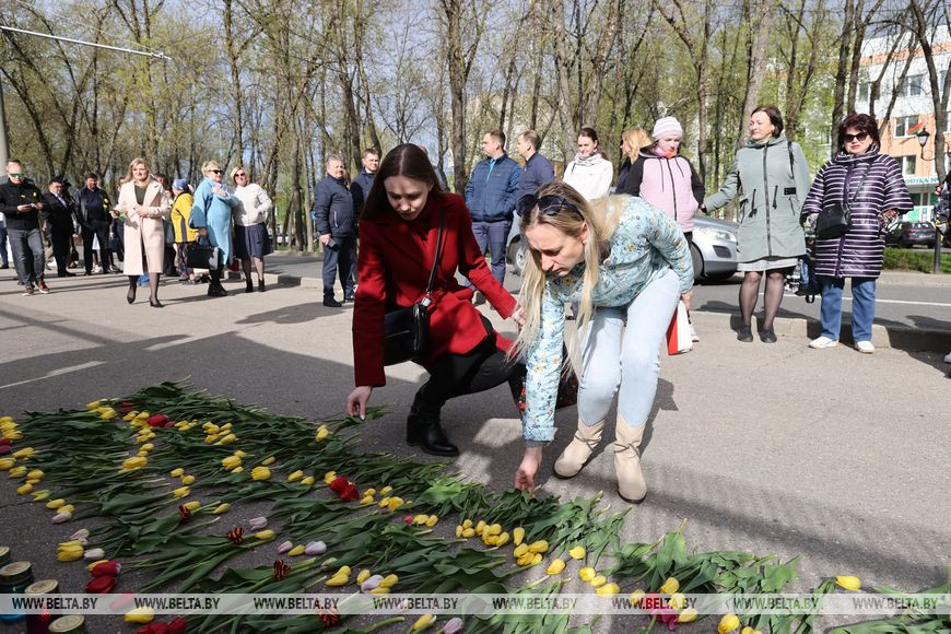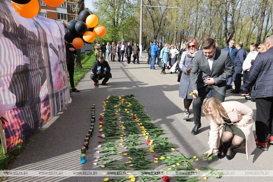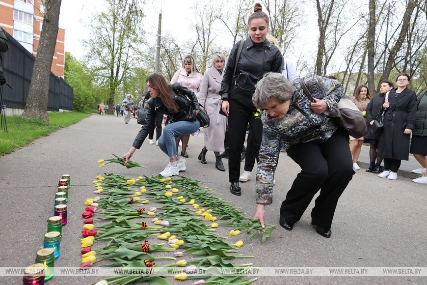16 мая, Витебск /Алеся Пушнякова - БЕЛТА/. Молодежь, представители трудовых коллективов, ветераны и участники войны возложили цветы у зажженных лампад возле консульства Латвийской Республики в Витебске в знак сохранения памятника Освободителям Риги, передает корреспондент БЕЛТА.