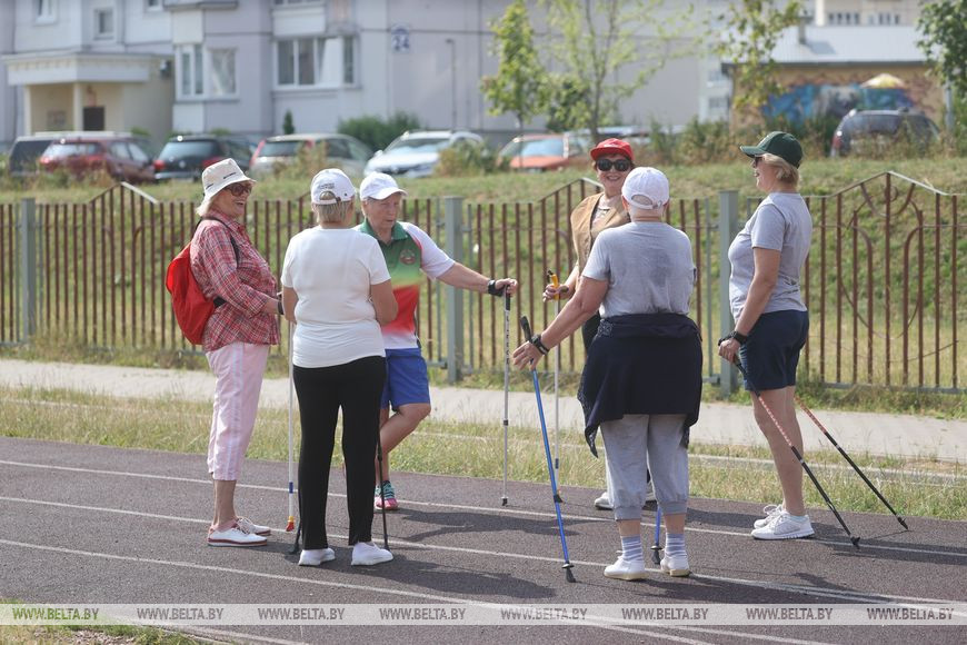 Тамара Соколовская, "серебряный" волонтер и руководитель клуба "Скандинавская ходьба", активно шагает по стадиону и подбадривает своих "девочек": "Давайте еще круг!". Пенсионерка уже четыре года возглавляет клуб и делится с нами: "Мы вырабатываем дыхание, укрепляем наши легкие. А еще при ходьбе происходит обогащение крови кислородом, улучшение работы лимфосистемы".