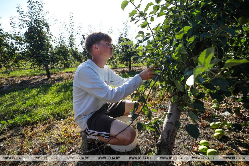В саду ОАО "Остромечево" в эти дни трудятся две бригады студентов-историков. Парни собирают и сортируют яблоки, укладывают их в контейнеры для перевозки. Четверокурсник Никита Доберчук второй год подряд ездит на уборку урожая яблок. "Это отличная возможность чуть продлить себе лето и неплохо заработать. Будем работать две недели - до 16 сентября", - рассказал студент. Никита родом из Пинска, но часто ездит помогать в деревню, поэтому такой труд для него не в новинку.