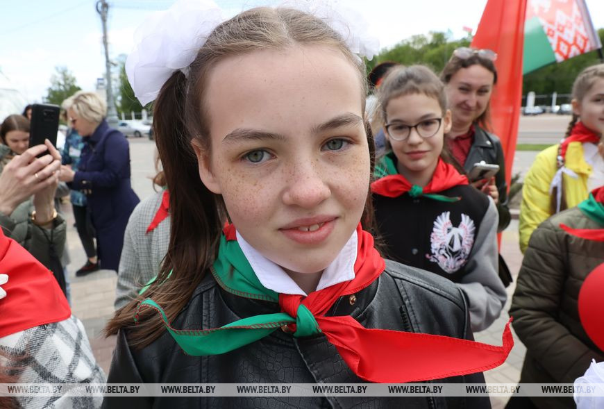 Торжественное обещание ребята дали хором. Почетные гости и ветераны движения повязали мальчишкам и девчонкам пионерские галстуки на площади Государственного флага. Председатель Гомельской областной организации БРПО Оксана Сираж рассказала, что в рядах пионеров в юго-восточном регионе объединены около 81 тыс. активных творческих и спортивных детей. Это более 75% ребят 7-14 лет, живущих во всей области. "И очень приятно, что наша большая дружная семья продолжает расширяться", - подчеркнула она.