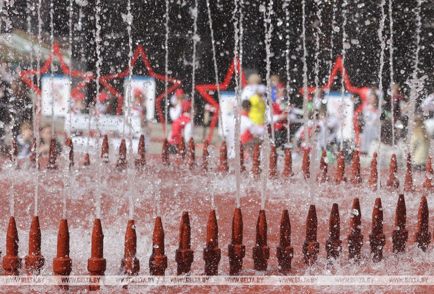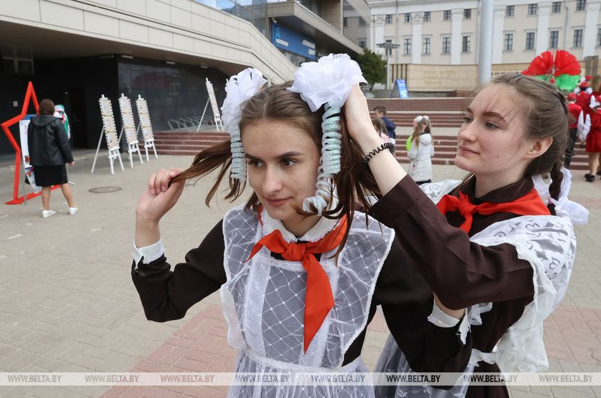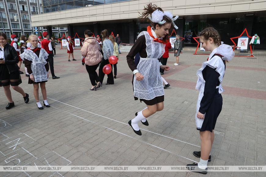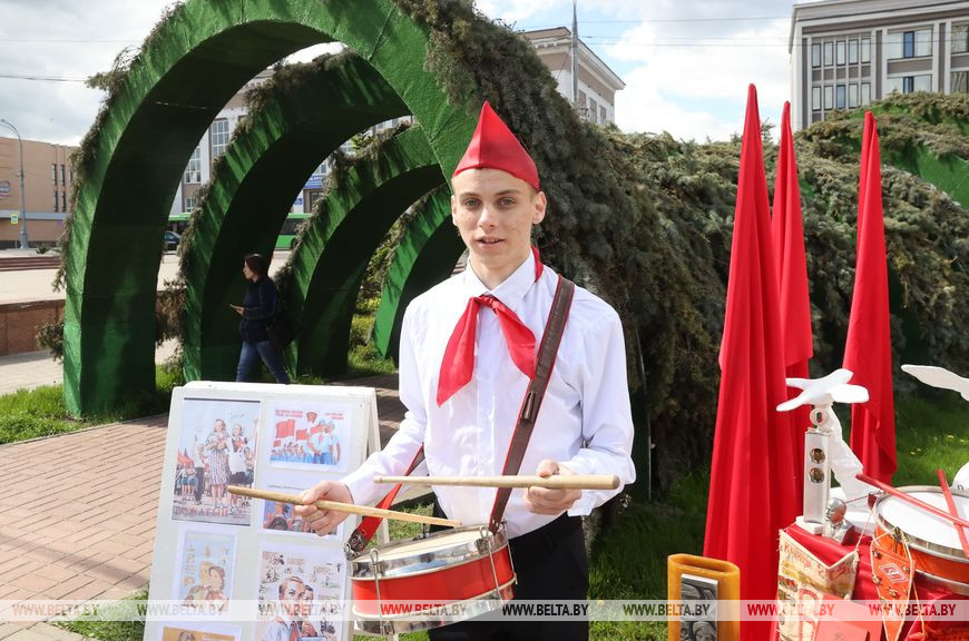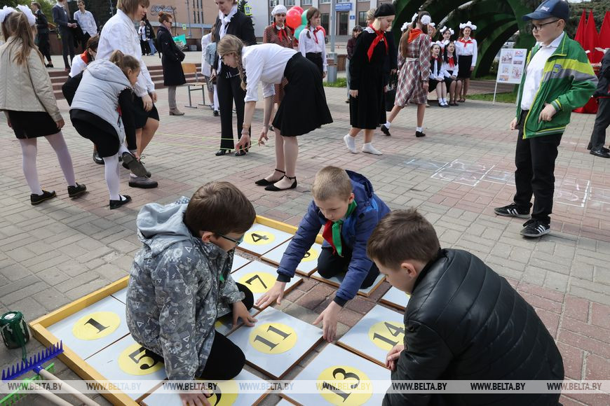 Возле фонтана у здания "Белтелекома" развернулся оживленный квартал детства. Здесь дан старт масштабному областному марафону в честь 100-летия пионерского движения. Проходящие мимо горожане с удовольствием окунулись в атмосферу, где веселились девчонки в коричневой школьной форме с белоснежными фартуками, мальчишки в синих пиджаках советского периода. Здесь можно было порисовать мелом на асфальте, пройти пионерский квест, попрыгать в классики, через скакалку, резиночку, сыграть в настольные игры, присоединиться к дружине и произнести речевки "Всегда готов!" и Всегда вперед - и ни шага назад!"