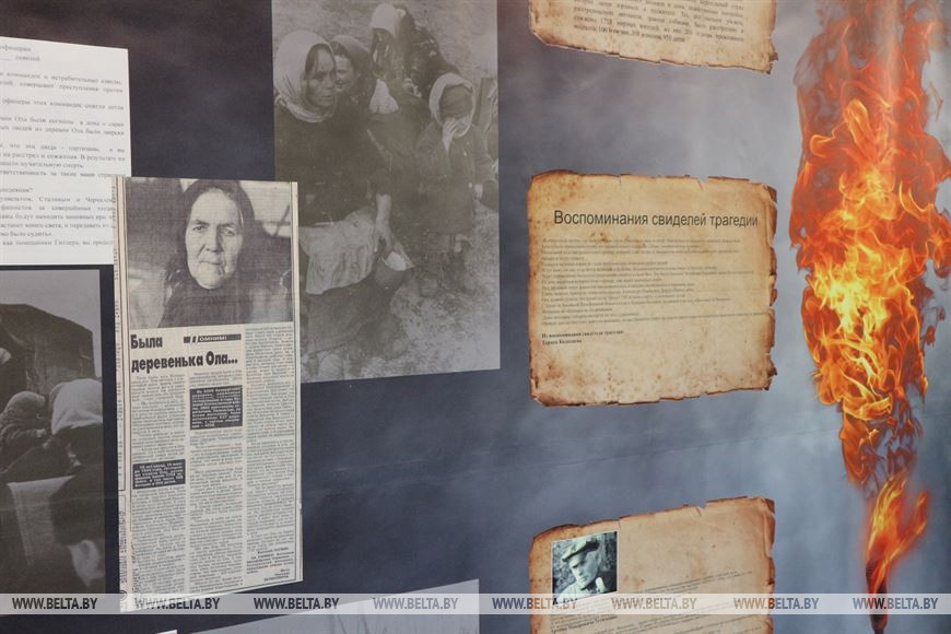Музейный павильон стал завершающим звеном в возведении мемориального комплекса на месте сожженной в годы войны деревни Ола. Экспозицию составили предметы, найденные во время строительства объекта. Это и предметы быта и обихода, и остатки поврежденной детской обуви.