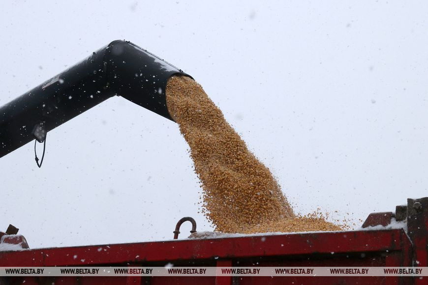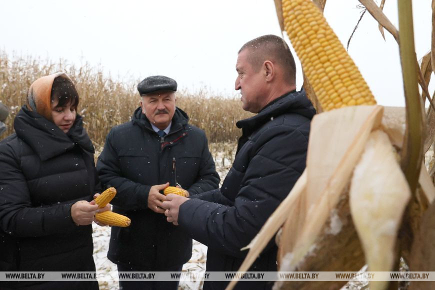 Леонид Заяц вместе с руководством района и области посетил поле агрокомбината "Заря", на базе которого была представлена и изучена практика уборки кукурузы на зерно при увеличенных посевных площадях. Так, культуру здесь убирают не при плюсовых температурах, а с первыми морозами - когда значительно снижается влажность зерна и соответственно затраты на его доработку. На сегодня многопрофильному хозяйству осталось убрать около 1 тыс. т кукурузы в Могилевском и Чаусском районах. Впоследствии она пойдет на корм птице и животным и будет составлять от 30% до 40% в их рационе, поэтому вопрос снижения затрат на зерно для хозяйства как никогда актуален.
