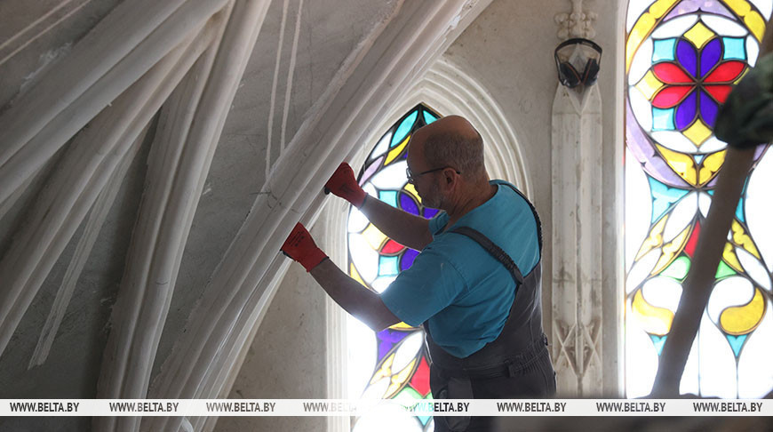Сейчас реставраторы заняты внутренними работами. Они кропотливо восстанавливают лепной декор свода. Завораживает каждая его деталь. Также выполняют отделочные работы в крипте. Планируется установка входной двери, покраска цоколя, устройство полов первого этажа и крипты. Государственной программой "Культура Беларуси" предусмотрено, что объект будет введен в эксплуатацию в конце текущего года.