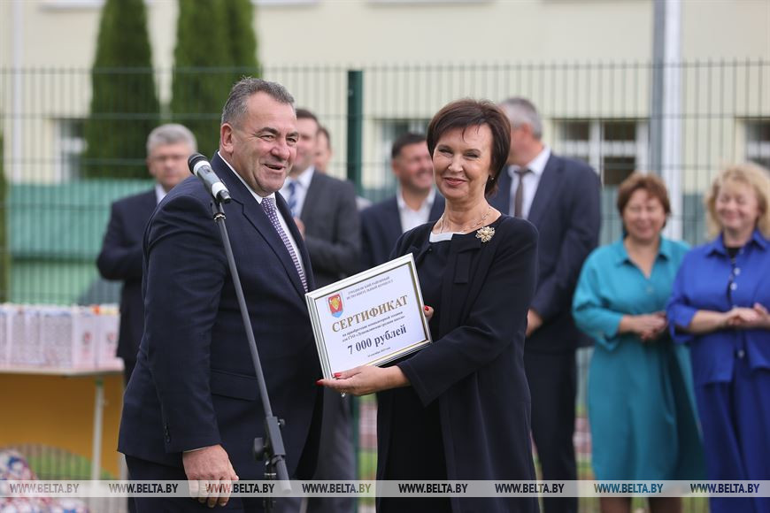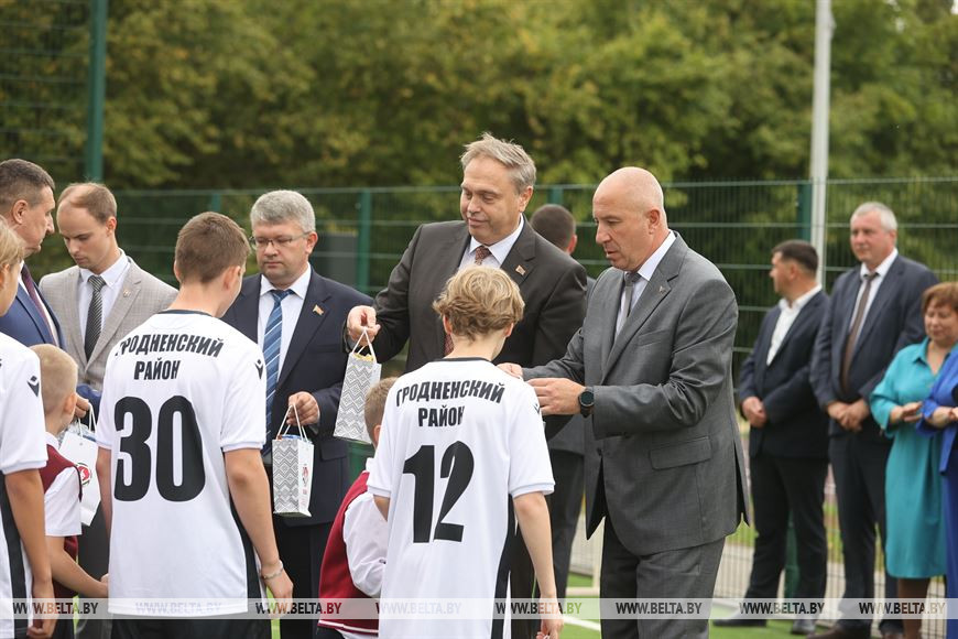 "Глядя на эти замечательные детские лица, глядя вокруг на замечательный развивающийся населенный пункт, я уверен, что у этой школы есть будущее, что 55 лет - это далеко не предел и школа будет развиваться дальше. Одним из ярких примеров этого развития является та площадка, которую мы открываем сегодня. Это тоже является примером того, что совместными усилиями мы можем многое: оперативно решать многие вопросы и делать жизнь наших людей лучше, безопасней, интересней. Появление этой площадки стало возможным благодаря тому, что совместными усилиями бюджета, Белорусской ассоциации футбола, Президентского спортивного клуба было создано не только поле для мини-футбола, площадка для воркаута, но в целом облагорожена и модернизирована спортивная инфраструктура школы, - сказал председатель Гродненского облисполкома Владимир Караник. - Я уверен, что она будет востребована, что никогда не будет пустовать. И что на этой площадке будут постоянно звучать радостные детские голоса. Для кого-то это станет первым шагом спортивной славы, для всех остальных - это возможность всестороннего гармоничного развития, здоровья будущих поколений".