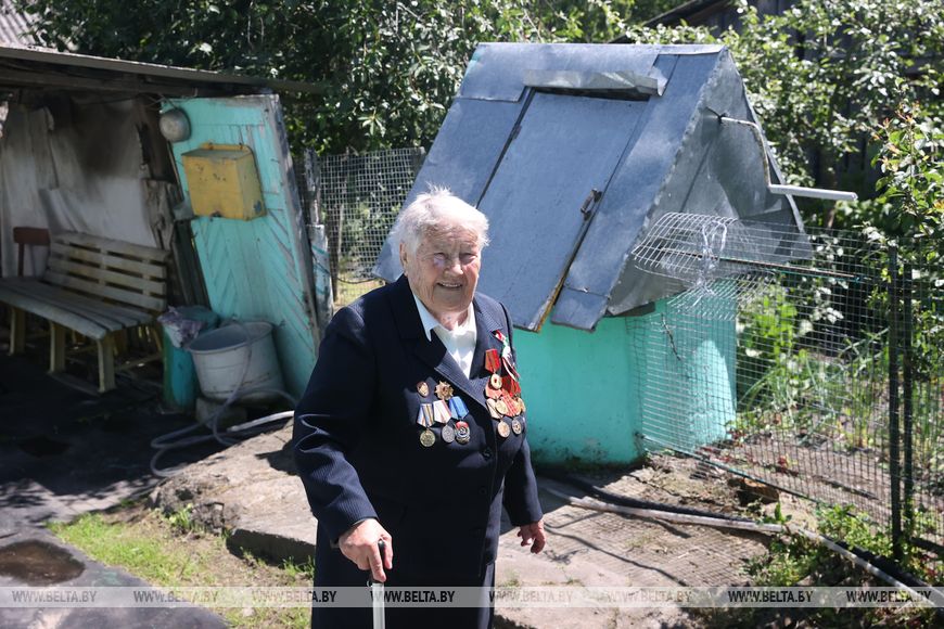 Уютный дворик, утопающий в летних цветах, зреющие на деревьях вишни и даже семья аистов на электроопоре - все говорит о том, что здесь живут счастье, спокойствие и мир. Хозяйка дома - Валентина Афанасьевна Костюковец, единственный из ныне живущих в Любанском районе ветеран Великой Отечественной войны, сегодня встречает гостей.