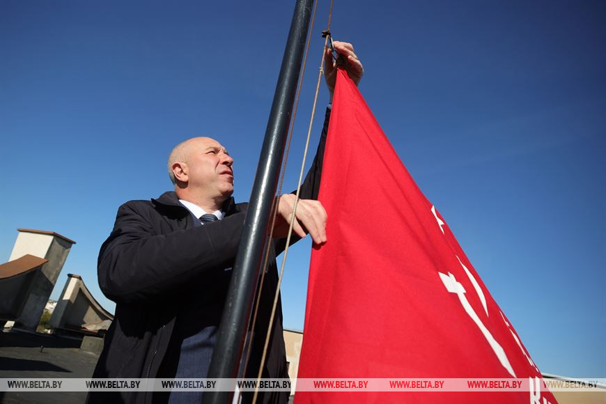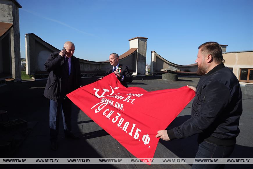 До начала мероприятий, посвященных Победе в Великой Отечественной войне, на крышу драматического театра знамя водрузил помощник Президента - инспектор по Гродненской области Юрий Караев.