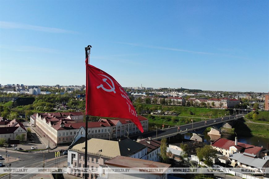 9 мая, Гродно /Корр. БЕЛТА/. Знамя Победы подняли над драматическим театром в Гродно, передает корреспондент БЕЛТА.