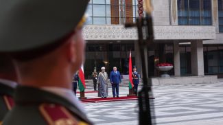 Официальным переговорам главы белорусского государства и Султана Омана предшествовала торжественная встреча во Дворце Независимости с участием роты почетного караула и исполнением государственных гимнов, а также церемония фотографирования.