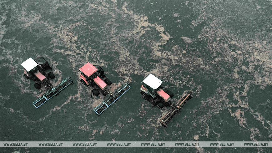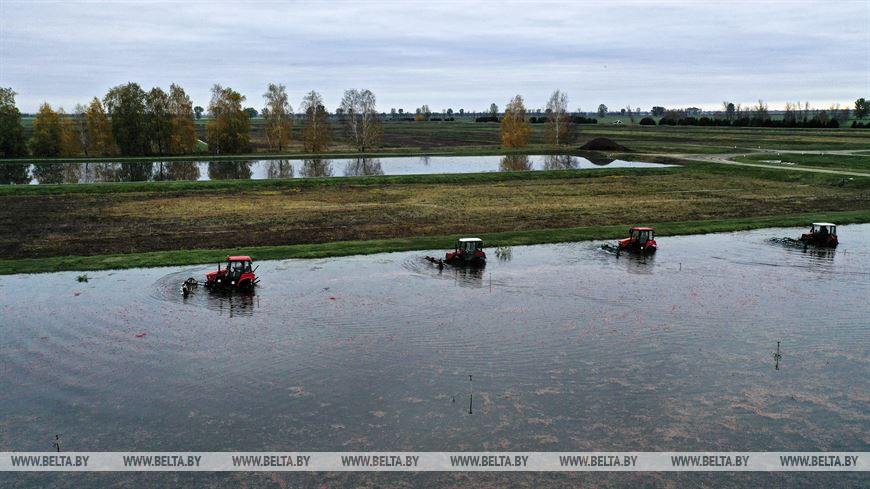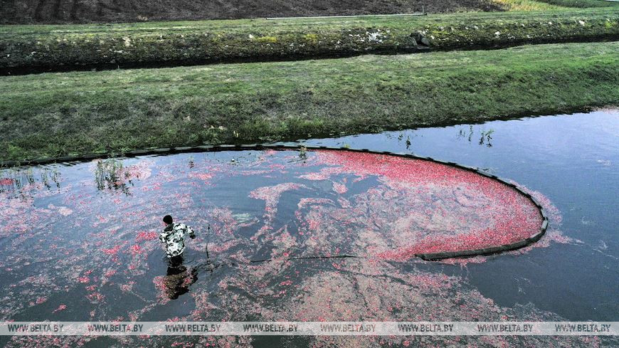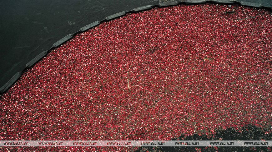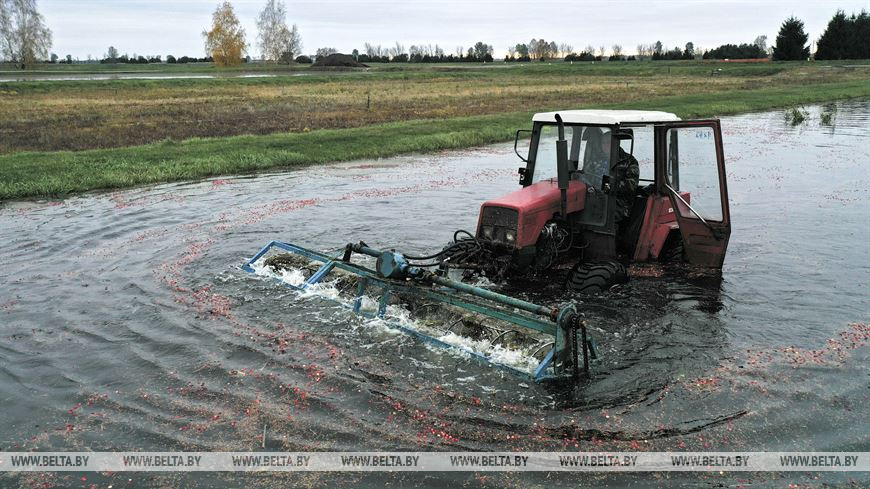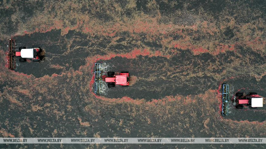 Ягода растет в так называемых чеках, с высоты птичьего полета напоминающих ровные дольки шоколада. Вдоль каждой - каналы со шлюзами. Сначала клюкву с "долек" собирают вручную, затем шлюзы открывают и вода заполняет ягодники. После этого на них синхронно выходит флотилия BELARUSов.