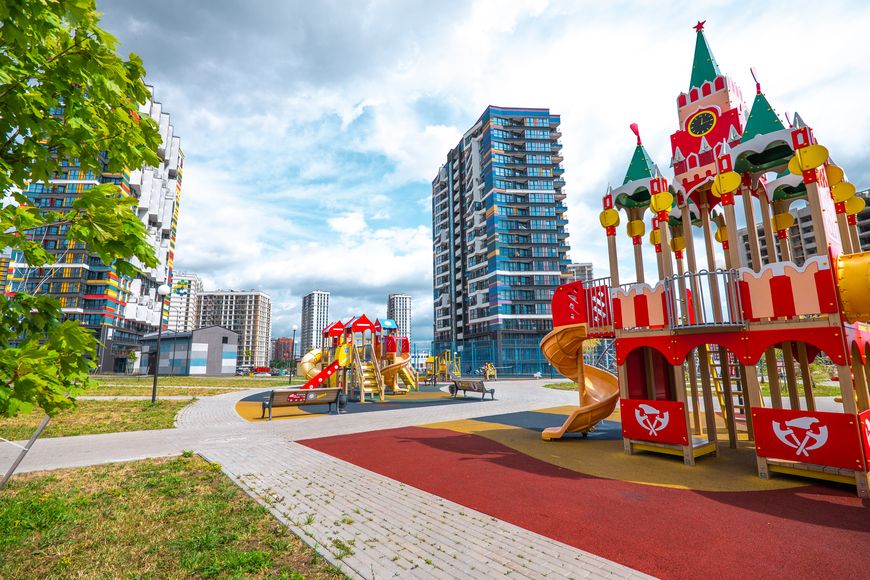 Для детей обустроены сказочно красивые и безопасные игровые площадки в виде замков и парусников, волшебных домиков и тропических джунглей.