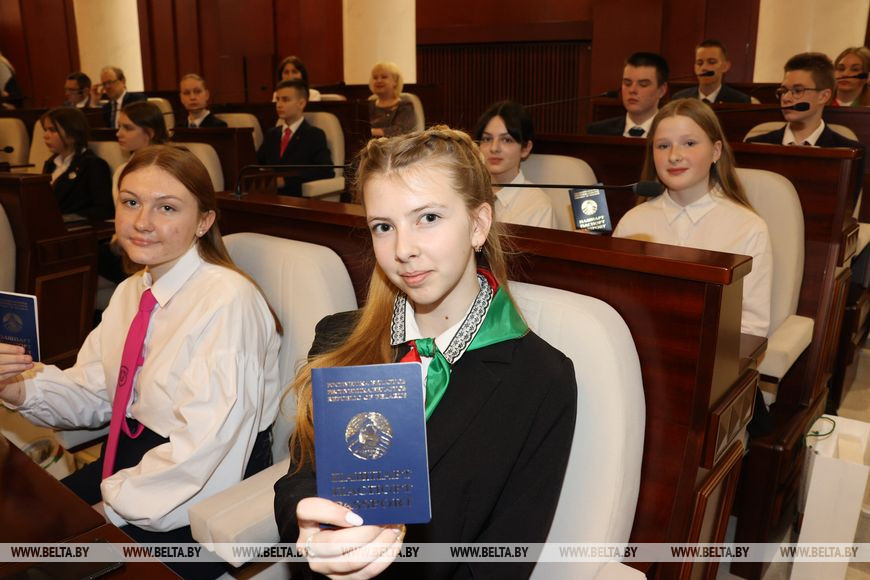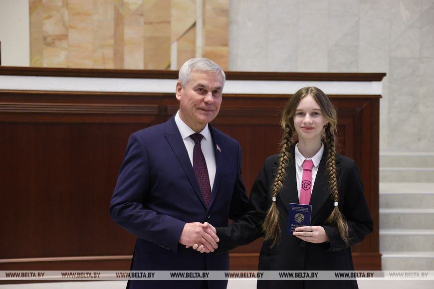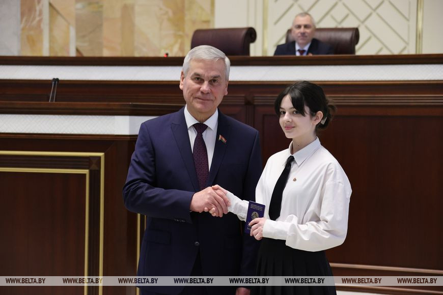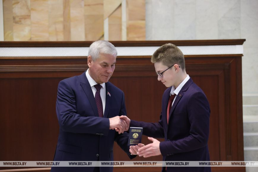 "Очень символично, что именно сегодня, 15 марта, в Палате представителей вы получаете путевки во взрослую жизнь, - отметил спикер. - Получение паспорта - значимое и торжественное событие для каждого человека, серьезный жизненный этап. Несмотря на такой юный возраст, вы уже своими делами, поступками доказали, что и ваша малая родина, Витебщина, и в целом Беларусь может гордиться вашими достижениями. Они у вас есть - в учебе, спорте, творчестве. Но мы прекрасно понимаем, что главные победы у вас еще впереди. Главное, чтобы вы понимали, что все в вашей дальнейшей жизни зависит именно от вас: от вашего умения, старания и трудолюбия. Важно, чтобы вы всегда оставались настоящими гражданами и патриотами Республики Беларусь".