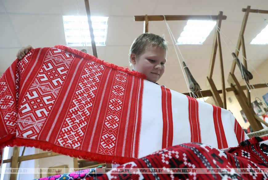 А Влад Езерский из четвертого класса спешит в очередной раз примерить что-то из неглюбского строя. Школьник буквально расцветает от комплиментов взрослых. И сам молодой человек успешно осваивает ткацкий станок. Его привела в кружок старшая сестра. Стал заниматься, как только ноги начали доставать до педалей. За работой неуемный живчик превращается в собранного и серьезного парня. "Поначалу было сложно, иногда и нитки неровно прибивал. Мечтаю доткать еще наш красно-зеленый флаг. Очень нравилось создавать узор "елочка" на полотенце. Домой выткал салфетки, всем понравились", - делится своим опытом начинающий ткач.
