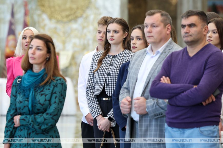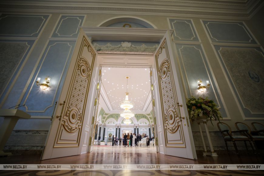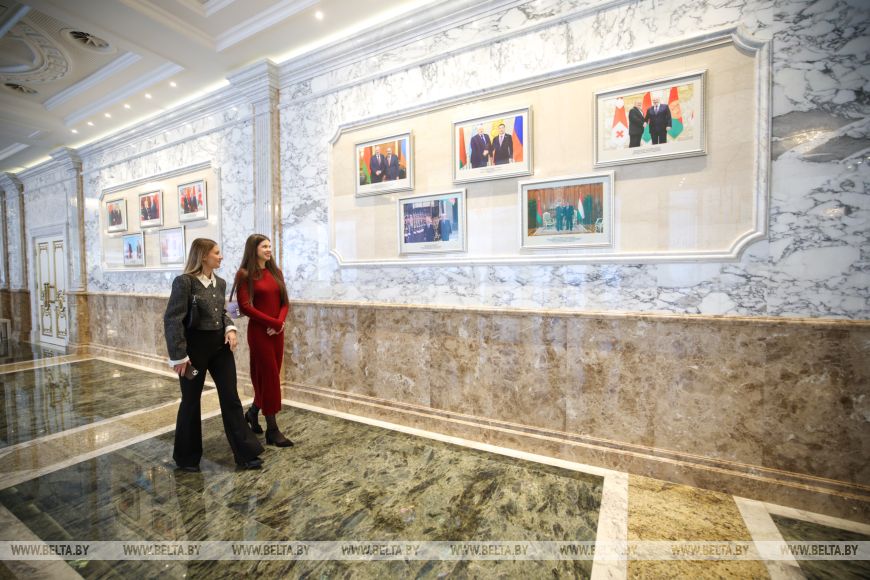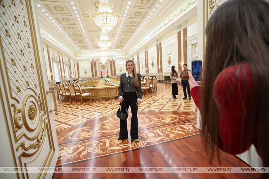 Посещение дворца по традиции началось с Зала торжественных церемоний - самого масштабного и вместительного. Здесь неоднократно проходила инаугурация Президента Беларуси. А еще в Зале торжественных церемоний глава государства встречает зарубежных лидеров, после чего проходит церемония фотографирования. Девушки, конечно же, не могли упустить возможность сделать фото и видео в таком красочном и живописном антураже.