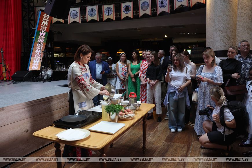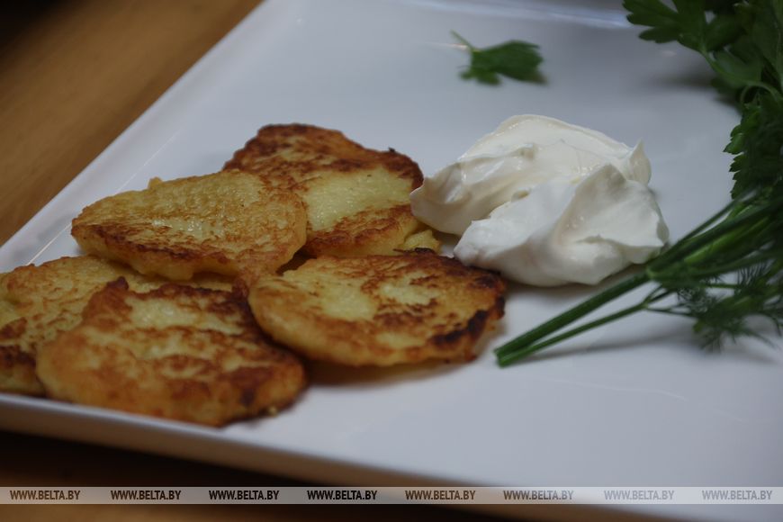 Частью фестиваля стал мастер-класс по приготовлению драников, который провела супруга главы МИД Наталья Рыженкова. Она поделилась с журналистами своим рецептом идеальных драников: "Драник, который я сегодня приготовила, без яйца и муки, с добавлением сметаны. Чувствуется натуральный вкус картофеля, без привкуса яйца и муки. Думаю, это и есть идеальный драник".-0-