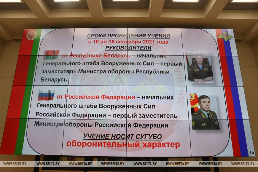 Начальник генштаба подчеркнул, что учение носит плановый характер и является завершающим этапом в системе совместной подготовки вооруженных сил Беларуси и России в этом году. "Прежде всего оно направлено на повышение обученности войск из состава региональной группировки, предназначенной для обеспечения безопасности в Восточно-Европейском регионе. Хотелось бы отметить, что "Запад-2021" - это учение оборонительного характера, подтверждающее курс Республики Беларусь на укрепление региональной безопасности и приверженность союзническим обязательствам с Российской Федерацией. Надеюсь, что после сегодняшней нашей встречи таких домыслов станет меньше и они не будут будоражить мировую общественность ни сейчас, ни после завершения учения", - отметил он.