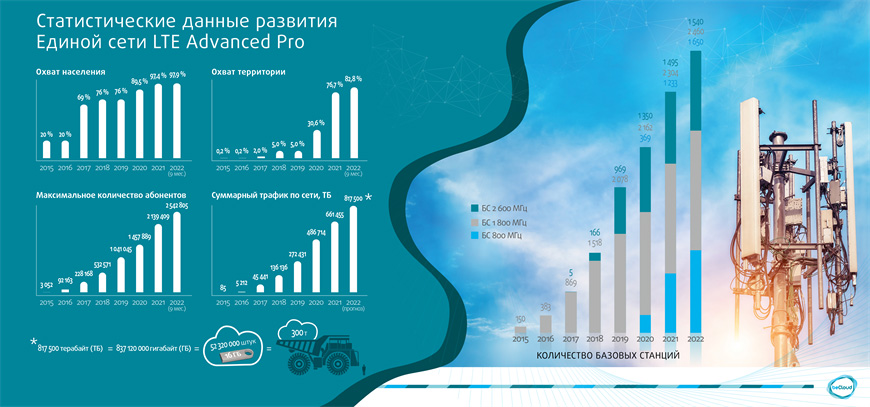 Первый сегмент сети LTE был запущен в Минске 17 декабря 2015 года, он работал на частотах 1 800 МГц и насчитывал 150 базовых станций. Спустя 7 лет их счет идет уже на тысячи - работу сети LTE сегодня обеспечивает более 5500 базовых по всей стране. Благодаря столь активному развитию сети, которая работает уже в трех частотных диапазонах - 1800 МГц, 2600 МГц, 800 МГц, связь 4G стала доступна более 97 % населения и охватывает более 80 % территории Беларуси.