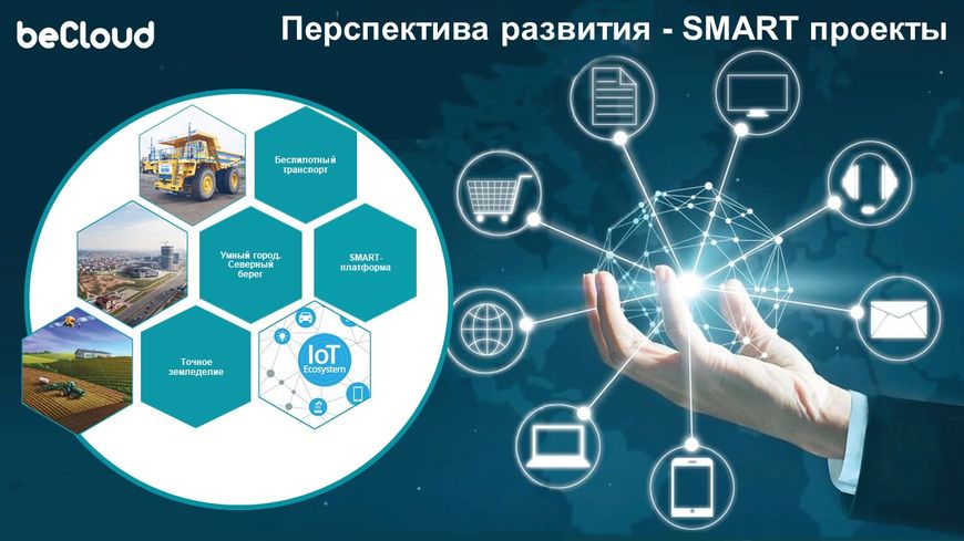 Есть значительные компетенции у beCloud и в сфере умных решений. Например, компания принимает участие в проектах с "БЕЛАЗом" и РУПП "Гранит", где на полигоне в Жодино и в карьере Ситницкого горно-обогатительного комбината апробирована работа беспилотных грузовиков и погрузчиков. В сельскохозяйственной сфере beCloud обеспечивает инфраструктуру для работы технологии "Точное земледелие" в одноименном проекте. А в 2020 году beCloud приступил к созданию smart-платформы - высокотехнологичного программно-аппаратного комплекса, которой предполагает интеграцию множества ИКТ-технологий (Интернета вещей, больших данных, облачных вычислений, искусственного интеллекта и пр.) для управления городской инфраструктурой: транспортом, образованием, здравоохранением, системами ЖКХ, безопасности и т.д. Кроме того, за beCloud закреплен статус оператора smart-платформы в рамках создания комплекса "Северный Берег" в Минске.
