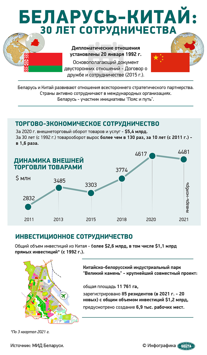 Оба государства поддерживают тесные и частые обмены на высоком и высшем уровнях, тесную координацию в международных делах, а также твердо поддерживают друг друга в вопросах, касающихся ключевых интересов двух стран, что отражает стратегическую ценность китайско-белорусского сотрудничества. На стадии активного развития находится сотрудничество между Беларусью и Китаем в области обороны, науки, техники, культуры и туризма. За 30 лет реализовано не менее 25 проектов в промышленности и энергетической сфере. А по итогам 2020 года Китай стал вторым торговым партнером после России.