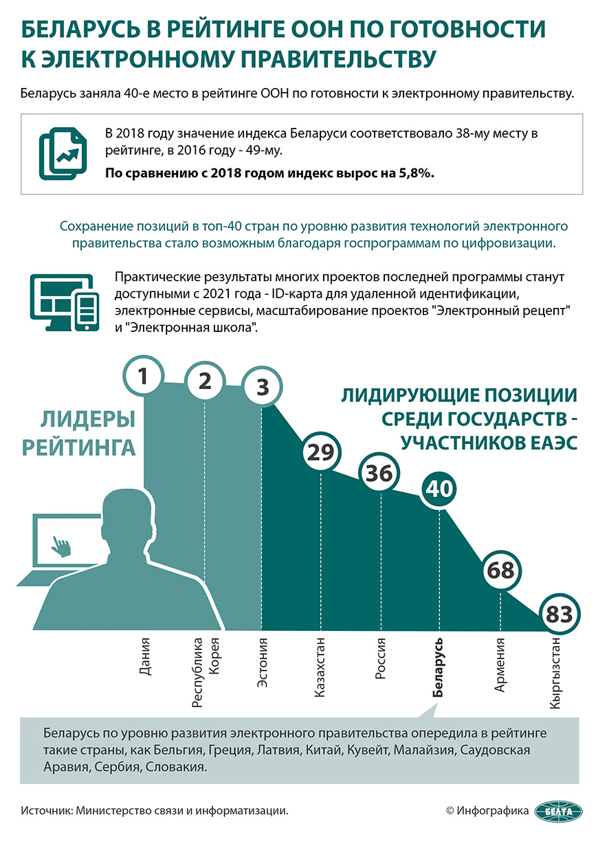 Таким образом Беларусь сохранила позиции страны с высоким уровнем готовности к электронному правительству. По сравнению с 2018 годом индекс вырос на 5,8%. В 2018 году значение индекса Беларуси соответствовало 38 месту в рейтинге, в 2016-м - 49 месту.