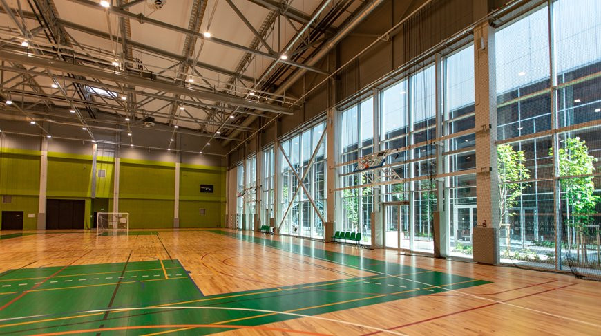 Конструкция спортивного комплекса выделяется также своим подходом к использованию дневного света. В потолки встроены прозрачные люки, которые, помимо стеклянных стен, позволяют максимально использовать естественное освещение. Дневной свет проникает так, чтобы не ослеплять спортсменов.