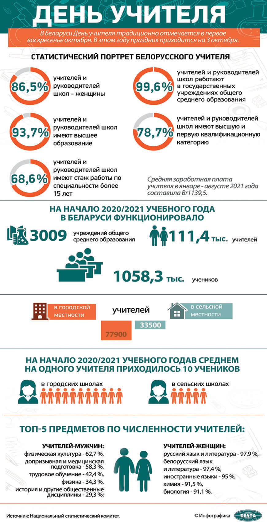 "Численность учителей (включая совместителей) в учреждениях общего среднего образования страны в 2020/2021 учебном году составила 111,4 тыс. человек (в том числе в городах и поселках - 77,9 тыс. человек, сельской местности - 33,5 тыс. человек). В общей численности учителей, преподающих отдельные предметы, представители сильного пола на начало 2020/2021 учебного года составили 18,3%, - рассказали в Нацстате. - В Беларуси функционирует 3009 учреждений общего среднего образования, где обучается более 1 млн учеников. В среднем на одного учителя приходится 10 учеников: в городских школах - 11, в сельских - 5 учеников".