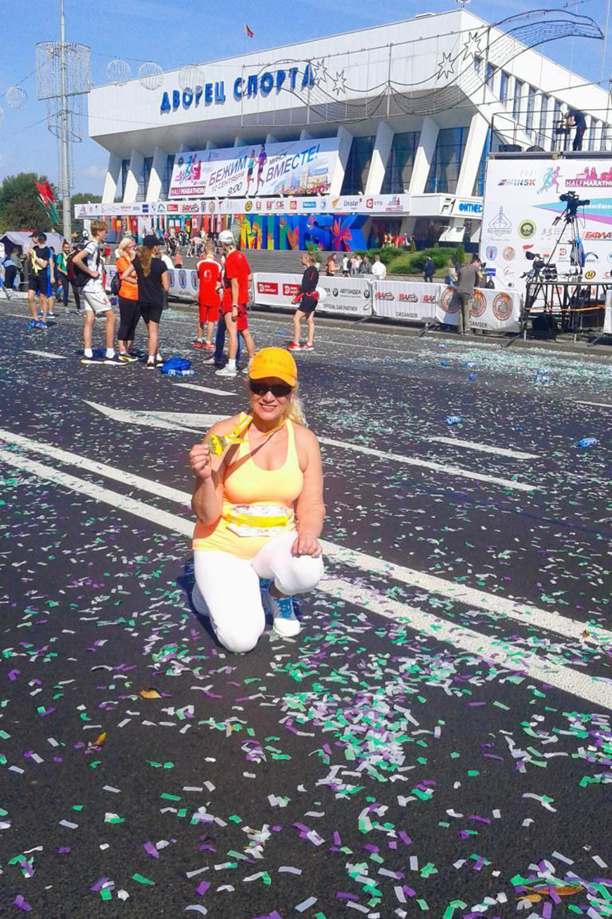 И через год она приняла участие в забеге на 3 км по проспекту Независимости. "Я была счастлива, вспомнились годы проведенные в спорте, и я снова в строю. На финише - медали, цветы, музыка. Это был незабываемый праздник. С этого и началось мое увлечение любительским бегом. Потом зарегистрировалась на Минский полумарафон 5 км, начала потихоньку готовиться, самостоятельно делать пробежки, чередуя с ходьбой, плавать, плюс велопрогулки. Старт полумарафона на проспекте Победителей был очень крутой. Эмоции через край, море людей, фотографий. Так я в один год стала участницей двух великолепно организованных мероприятий и заболела бегом", - поделилась женщина.