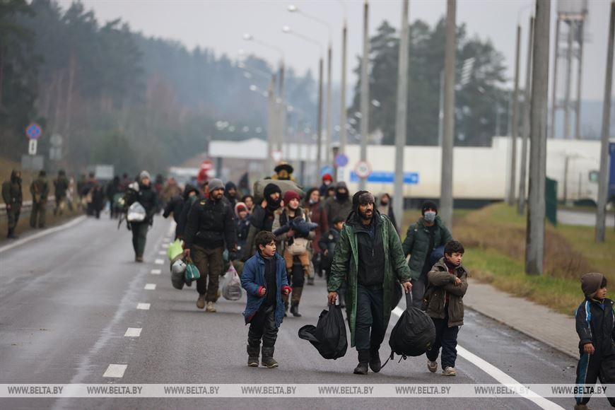 18 ноября, Гродно /Корр. БЕЛТА/. Беженцев в лагере у КПП разделили на группы, их переводят в транспортно-логистический центр, передает корреспондент БЕЛТА.