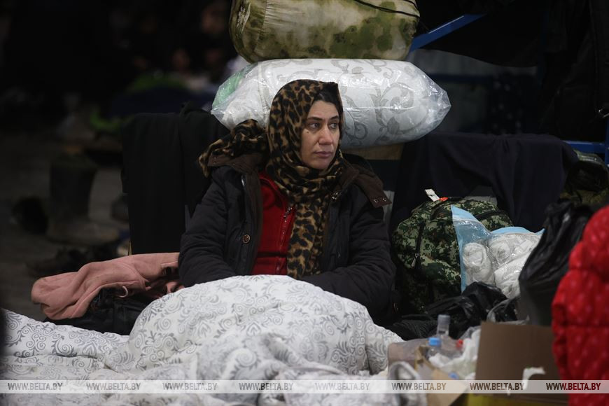 Сегодня идет 22-й день для беженцев на границе. Находятся они в пункте временного размещения в транспортно-логистическом центре рядом с пунктом пропуска "Брузги".