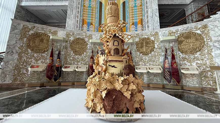 "Экспонат" для Дворца Независимости от Брестской области испекли мастерицы ОАО "Берестейский пекарь". Каравай получился тематическим - с украшениями в виде мельницы и колосьев. Нашлось место и для символов региона: на каравае можно увидеть зубров - хозяев бескрайней Беловежской пущи. Надпись "1 000 000 тонн" объясняет, по какому случаю хлебный "экспонат" прибыл во Дворец Независимости.
