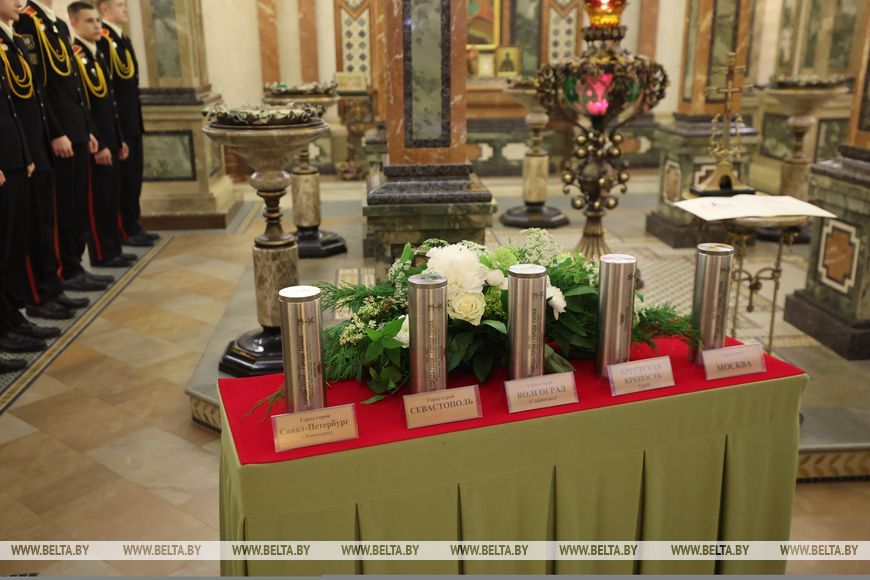 "По благословению патриарха Кирилла в каждом городе-герое наши экипажи брали землю с братских захоронений и помещали ее в специальные капсулы. Сегодня мы доставили эти капсулы в храм Всех святых в Минске", - отметил он.