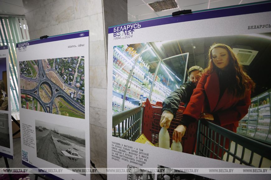 Выставка БЕЛТА "Беларусь. Взлет" - это 40 уникальных плакатов с фотографиями за период 30-летнего пути независимой Беларуси. Они сделаны в начале 1990-х фотографами информагентства Аркадием Николаевым, Владимиром Шубой и Александром Дидевичем. Также при подготовке экспозиции использованы уникальные снимки Белорусского государственного архива кинофотофонодокументов в Дзержинске. На каждом плакате размещены QR-коды, просканировав которые, можно получить еще больше информации.