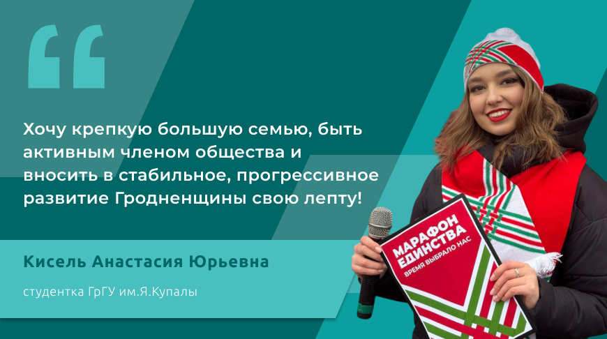 "Стараюсь быть такой же открытой и активной, искренне делюсь своими взглядами на жизнь с ровесниками, - говорит Анастасия. - Так же стремлюсь развиваться, становиться лучше, идти к целям. Недавно начала работать на городском телеканале, веду молодежную программу. И у меня есть идея сделать еще одну, тоже молодежную, общественно-политическую. Чтобы в ней, как и на встречах в коллективах, доносить до аудитории то, что считаю правильным, честным, патриотичным. Конечно же, хочу создать в будущем крепкую большую семью и сочетать это с профессиональным ростом. Хочу быть активным членом общества и вносить в стабильное, прогрессивное развитие страны и Гродненщины свою лепту. Ведь, как сказал наш Президент, молодежи не нужны тепличные условия, мы должны формироваться как ответственные граждане своей страны, готовые трудиться, справляться с вызовами, беречь и защищать то, что создано."-0-