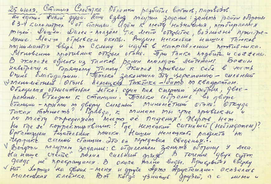 Аврутин-старший фиксировал свои мысли и наблюдения в тонкие блокноты, которые легко помещались в нагрудном кармане гимнастерки. Через тридцать лет после Победы фронтовик старательно перенес записи в толстую тетрадь, дополнив их небольшим послесловием.