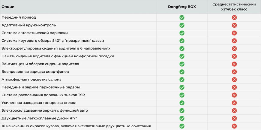 В отличие от многих электрокаров с задним приводом, BOX оснащен переднеприводной системой - решение обеспечивает уверенную управляемость и предсказуемое поведение на дороге, особенно в зимних условиях.Dongfeng BOX по умолчанию оснащен активными системами помощи водителю ADAS второго уровня, объединяющими целый набор систем, повышающих комфорт и безопасность каждый день. Среди них:
