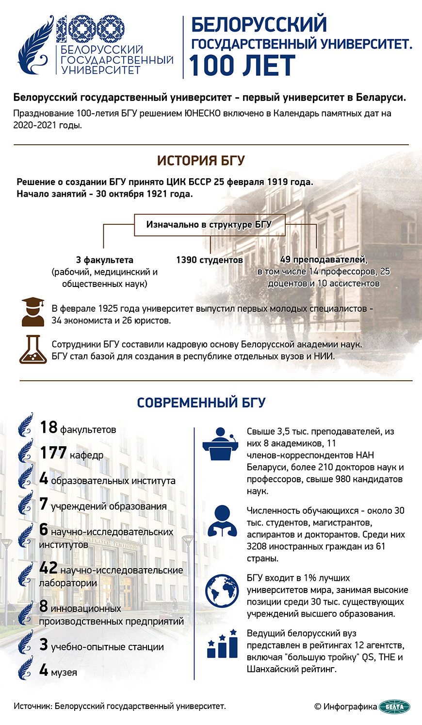 Решение о создании Белорусского государственного университета было принято 25 февраля 1919 года. Однако организационные работы затянулись в связи с временной оккупацией Минска. В мае 1921 года был объявлен прием на рабочий факультет. 30 октября 1921 года состоялось торжественное собрание, посвященное началу занятий. Именно эта дата положила начало вековой истории университета. 1 ноября 1921 года начались регулярные занятия для 1390 студентов на трех факультетах - рабочем, медицинском и общественных наук.