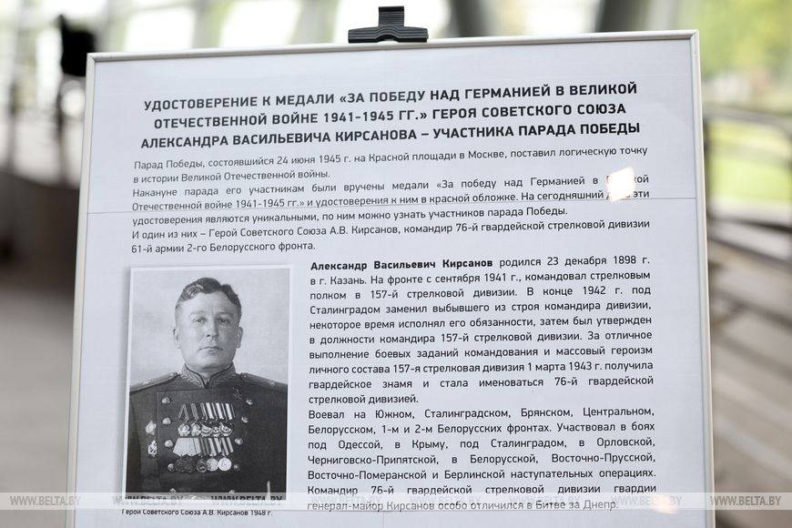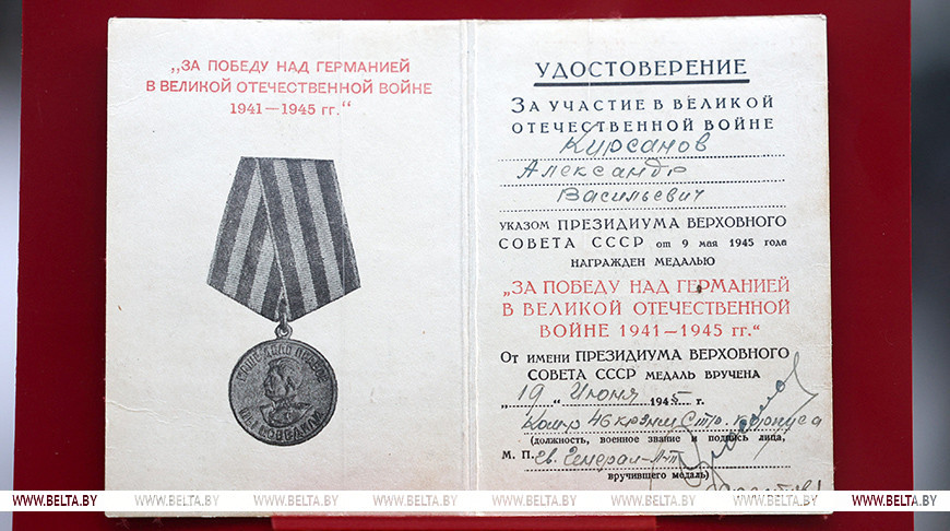 Как рассказали в Музее истории ВОВ, уникальность удостоверения заключается в обложке красного цвета. Такие удостоверения выдавали только участникам парада Победы 24 июня 1945 года, и одним из получивших его стал Александр Кирсанов. "Именно такое удостоверение в нашем музее единственное, и оно уникально. Как и большинство документов, материал поступил от родственников, в данном случае от его сына. Сам Александр Васильевич скончался в 1994 году, а в 1997-м его сын передал все его личные вещи, награды, в том числе и удостоверение к этим наградам", - рассказал старший научный сотрудник отдела письменных и изобразительных источников фондов музея Виктор Русецкий.