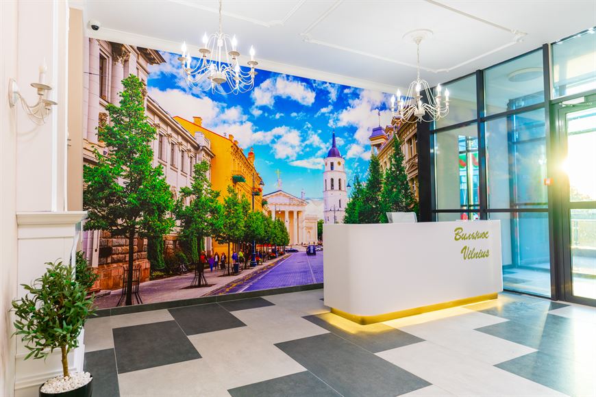Перешагнув порог, вы увидите картину достопримечательностей одного из прославленных городов, в честь которого названа новостройка. Здесь есть стойка консьержа, санитарная комната с пеленальным столиком, место для отдыха гостей с маленькой библиотекой.