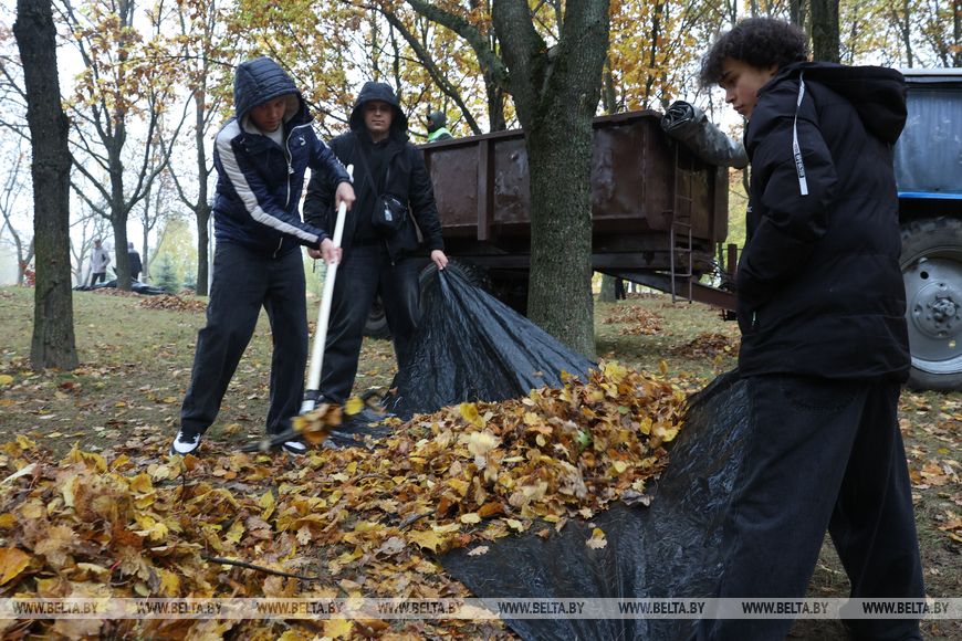 В Московском районе трудились школьники и учащиеся местных колледжей: подметали дорожки, сгребали листву и загружали ее для вывоза. Через несколько часов здешний парк Павлова было не узнать.