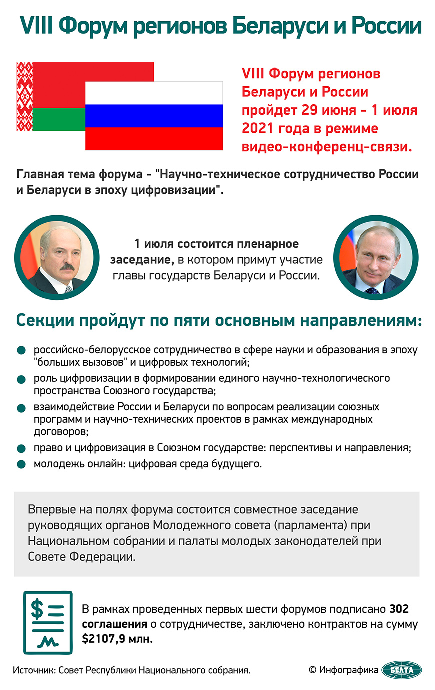 VIII Форум регионов Беларуси и России стартовал сегодня и пройдет по 1 июля. Его основные мероприятия организованы в режиме видеоконференции из-за пандемии COVID-19.