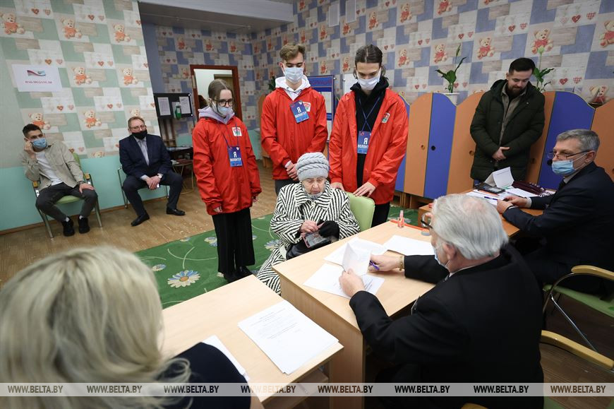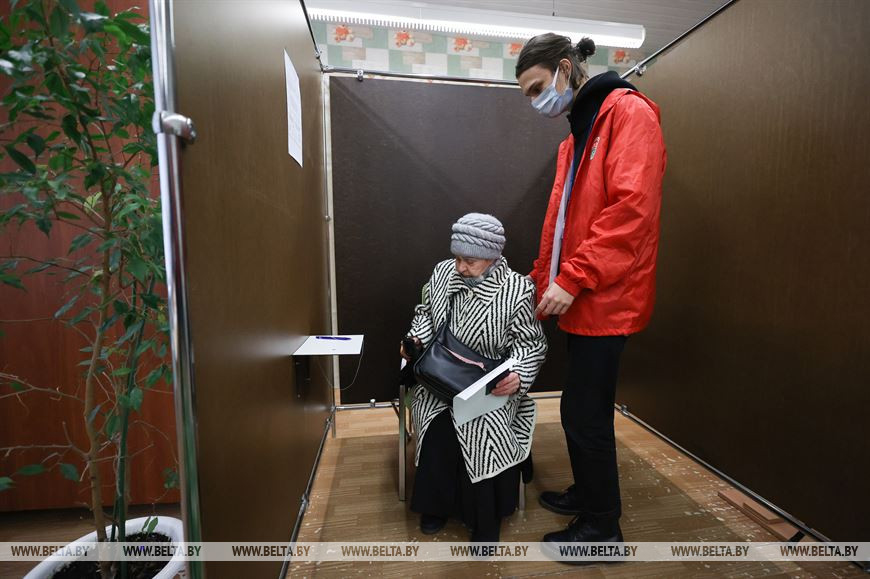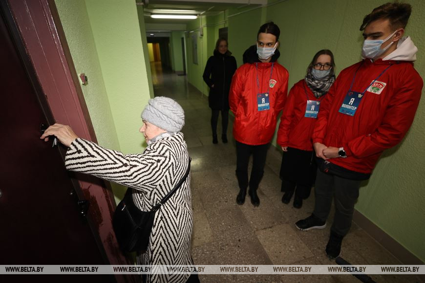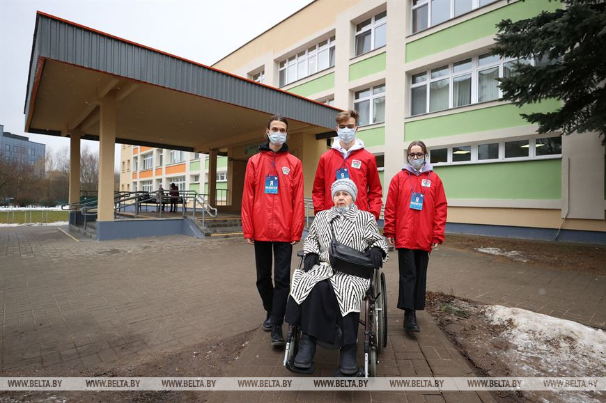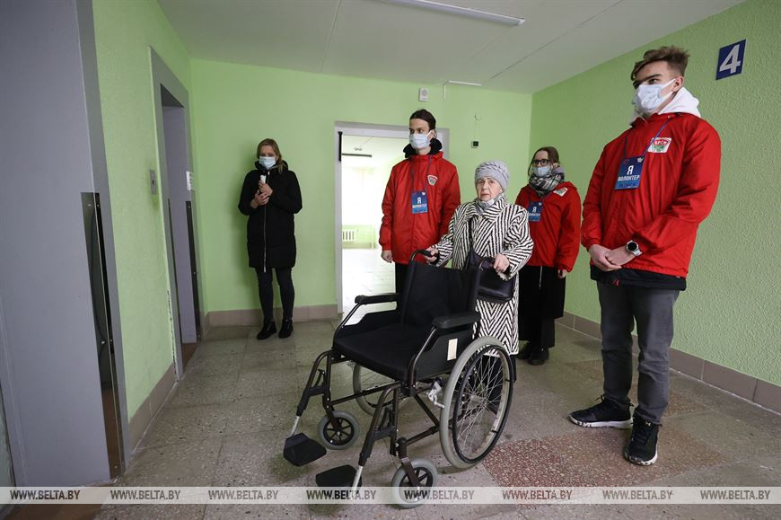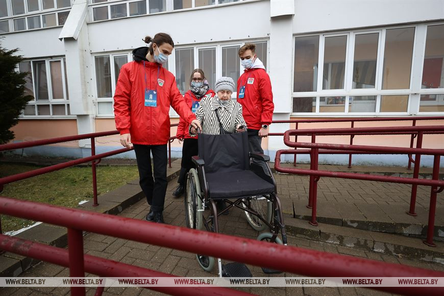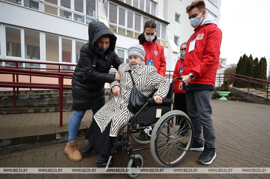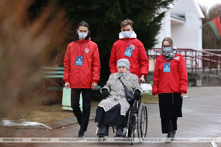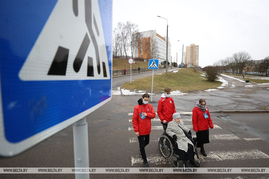 25 февраля, Минск /Корр. БЕЛТА/. Волонтеры движения БРСМ "Доброе сердце" помогают маломобильным гражданам добраться до избирательного участка и принять участие в голосовании на референдуме.-0-