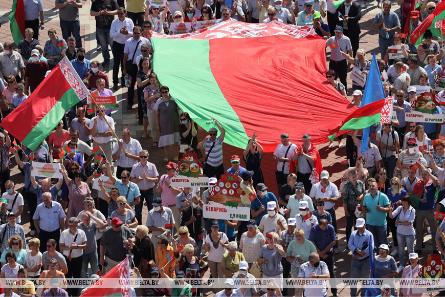 16 августа, Минск /Корр. БЕЛТА/. В белорусскую столицу приехали жители со всех регионов Беларуси. Люди собрались на площади Независимости на митинг в поддержку мира, безопасности и спокойствия в Беларуси.